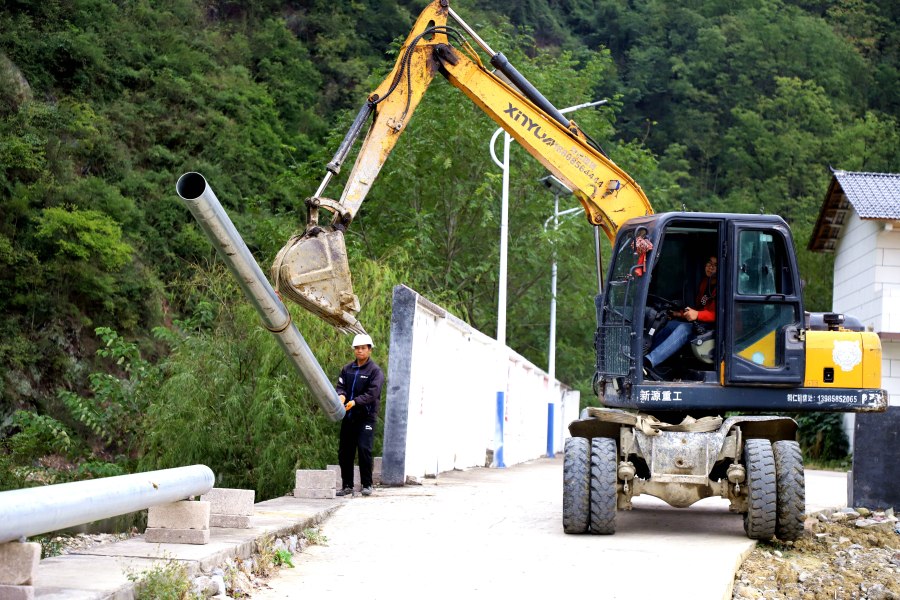 今年,印江自治县投入资金1.48亿元,实施清渡河至县城水站连通、洋溪镇农村规模化供水和东南部片区农村规模化供水工程,构建“多源互济”供水体系,全面提升农村供水保障能力。图为10月26日,木黄至合水段供水管道施工现场。(印江融媒体中心记者 王治洪)