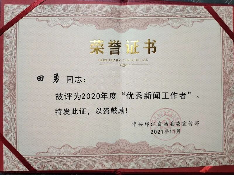 16年深耕不辍,蒋智江用敬业与奉献收获了诸多荣誉:全省好新闻奖、省市级优秀通讯员、铜仁市创建梵净山国家5A旅游景区先进个人、印江县脱贫攻坚先进个人、优秀共产党员……一张张荣誉证书,是对他工作的肯定,更是他践行新闻初心的见证。