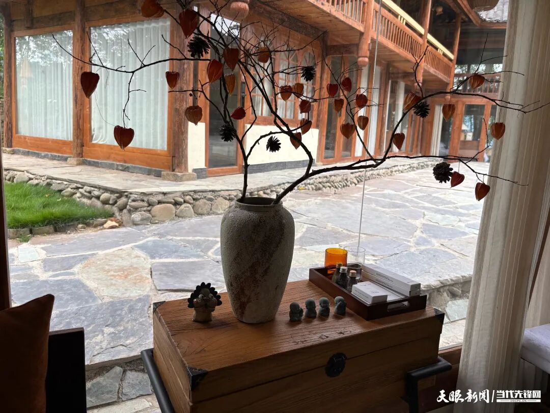 从想法落地到民宿建成,胡姣花了年时间。既要保留当地文化根脉,又要融合现代元素,让老木屋焕发新生,将闲置吊脚楼的木梁、木柱重新打磨利用。“每一寸空间,我都亲自设计,每一个物件,都是我精心挑选的。”走进民宿,12间客房各有特色:有的推窗就是潺潺溪流,有的自带小阳台可观山景,屋内的装饰更是藏满巧思——手工捏造的陶艺摆件、别具一格的斗柜、大自然馈赠的花草......处处透着“把当地元素穿在民宿里”的用心。