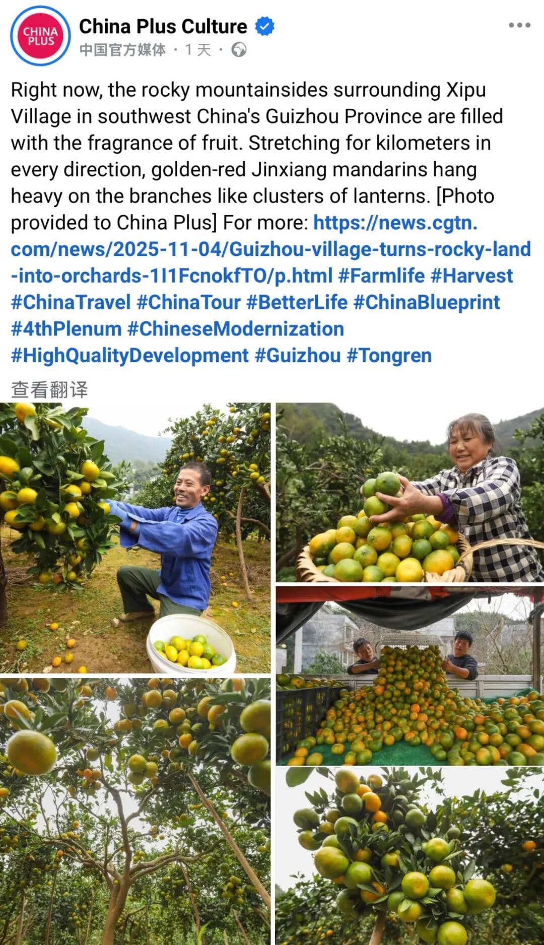 ▲11月9日,中国环球文化网报道:贵州印江柑橘