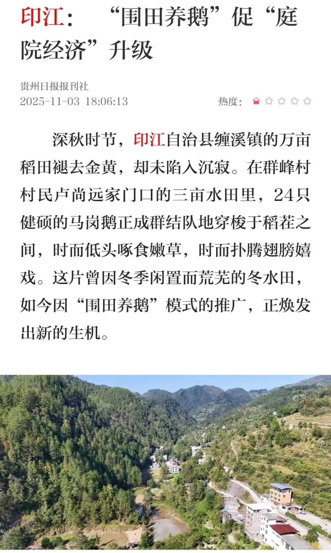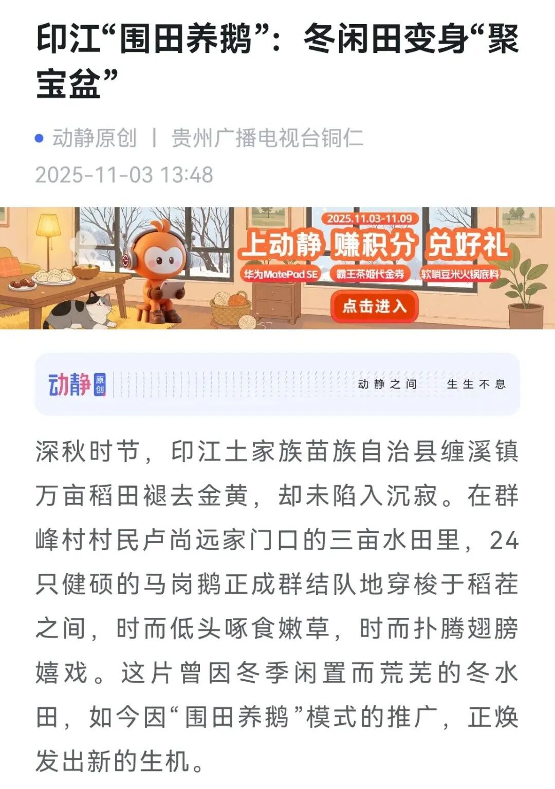 ▲11月3日,动静贵州报道:印江“围田养鹅”:冬闲田变身“聚宝盆”