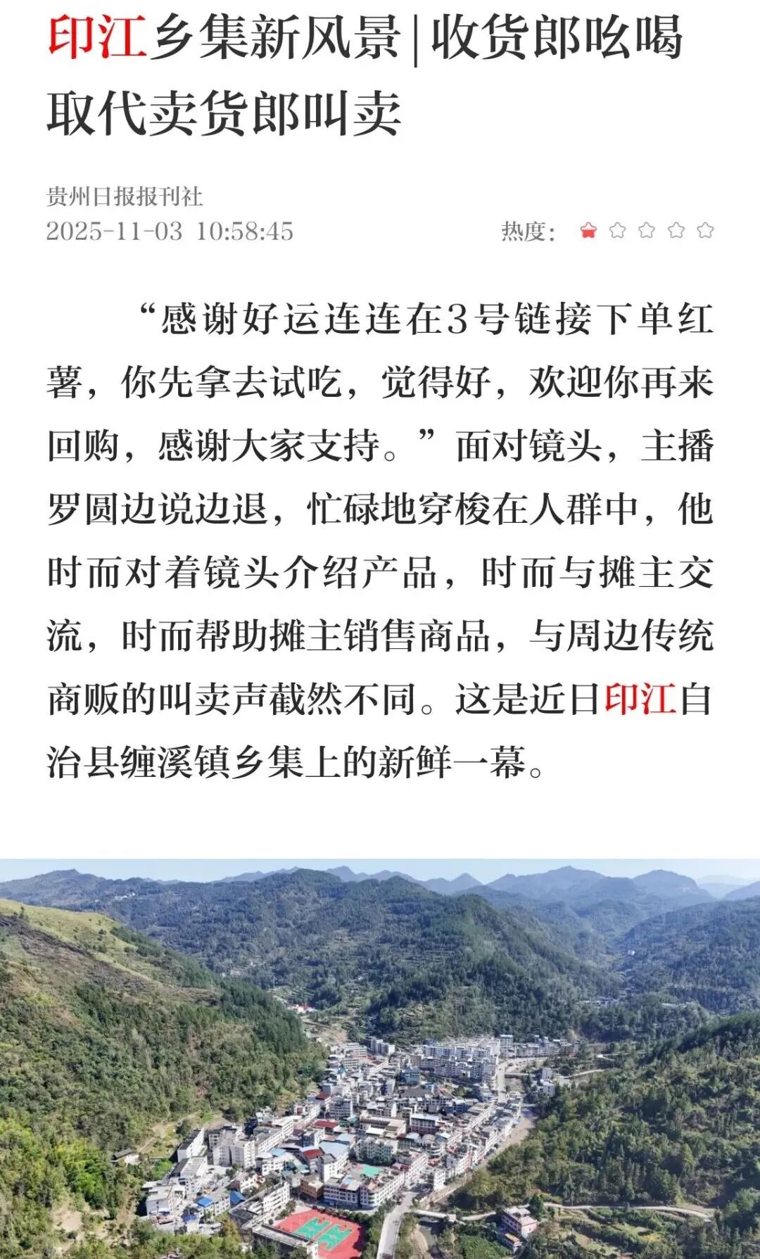 ▲11月4日,《铜仁日报》报道 “卖货郎叫卖"变成了“收货郎吆喝”印江“村播”助力农特产品出山