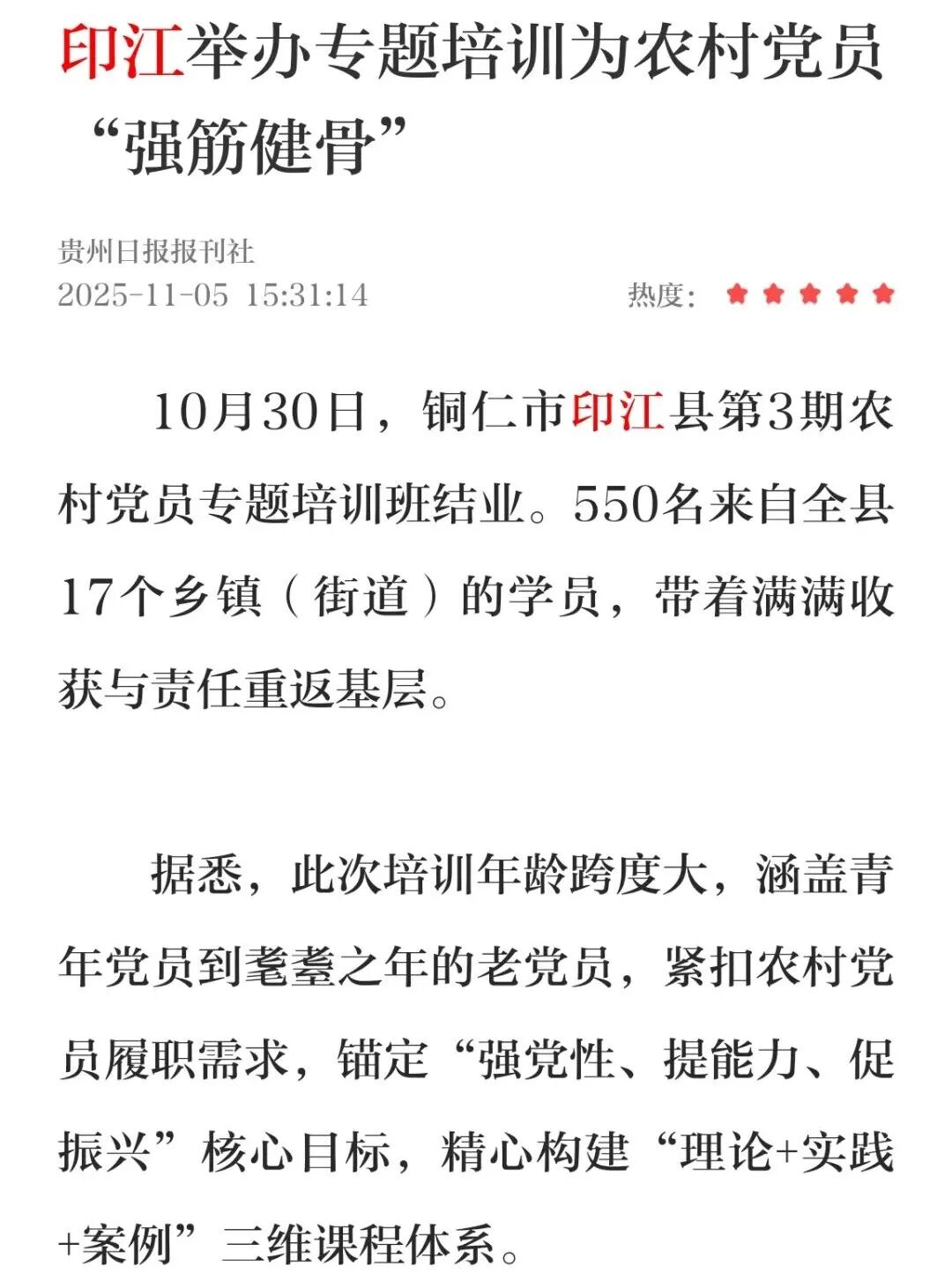 ▲11月6日,《铜仁日报》报道 印江农村党员“充电蓄能”激活发展新动能