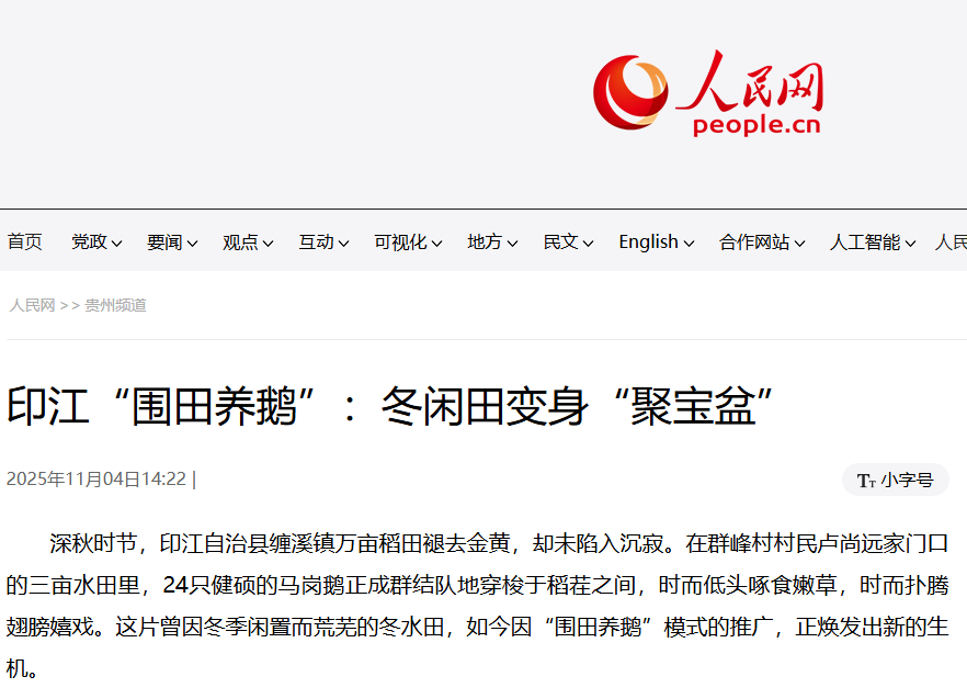 ▲11月4日,CCTV-17农业农村频道报道:提升农业综合生产能力 贵州印江 围田养鹅 冬闲田变生态养殖场