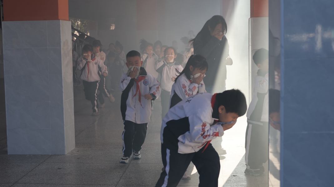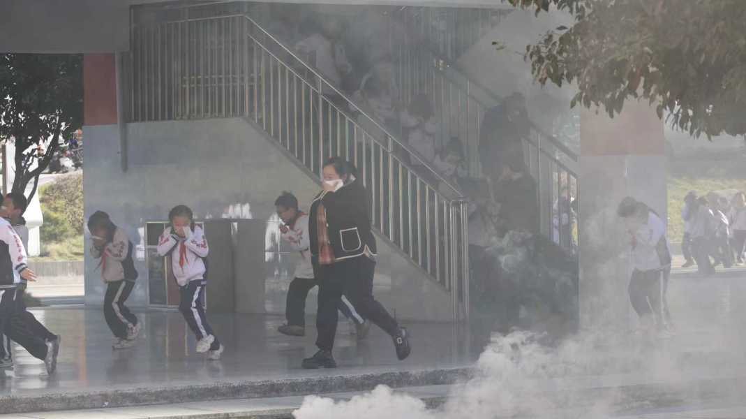 9:50分,各教学楼楼梯口责任人点燃烟雾弹,一键式报警器响起。学校安全办随即报告“火情”,学校立即启动火灾应急预案。