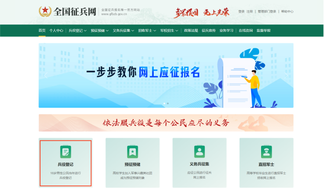 第五步:登录或注册完后,进入登记,点击“开始兵役登记”: