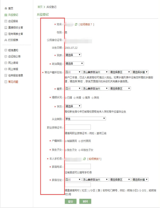 已参加兵役登记,且年龄在24周岁以内的,无论是否应征报名,都需要再登录“全国征兵网”对个人兵役登记信息进行核验,家庭信息、学业信息和联系电话有变化的应及时修改。