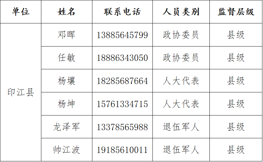 为做好廉洁征兵工作,增强征兵工作透明度,保证全县征兵工作公开、公平、公正,防止和纠正征兵工作中的不正之风,切实维护广大应征青年的合法权益,现将印江自治县廉洁征兵监督举报电话及廉洁征兵监督员信息予以公示,欢迎社会各界对征兵工作进行监督。 印江自治县人民政府征兵办公室监督举报电话:0856-6223458;18885683338。监督举报邮箱:2180035905@qq.com。