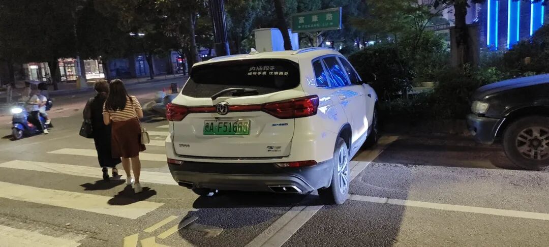 此车在东晟书馨苑(富康路)附近随意停放在斑马线上,影响行人通行。