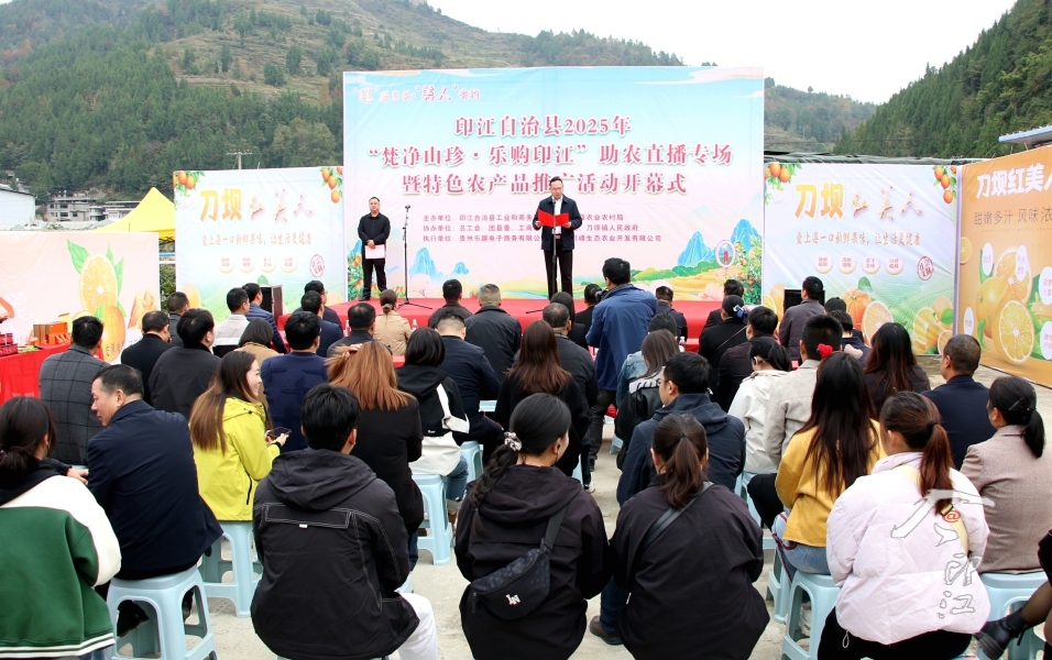 魏元春在致辞中说,印江自治县2018年获评“全国电子商务进农村综合示范县”以来,持续完善“云仓+电商驿站+三级物流”服务体系,有效破解了农产品“出山难”问题。去年,通过电商直播平台,刀坝“红美人”单场销售突破8万斤,销售额超50万元,实现了“丰收果”向“致富果”的转变。