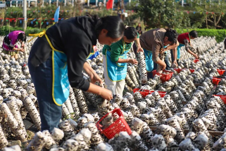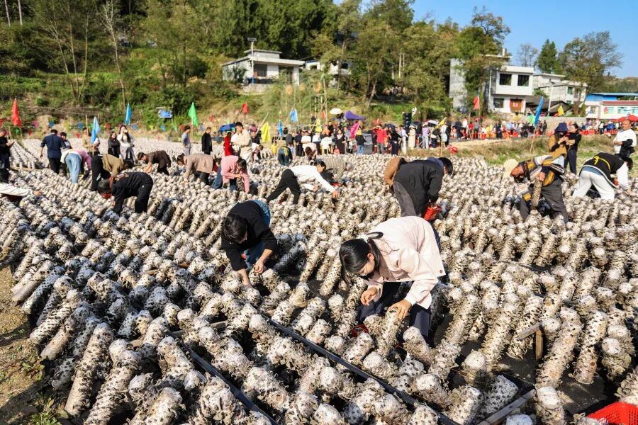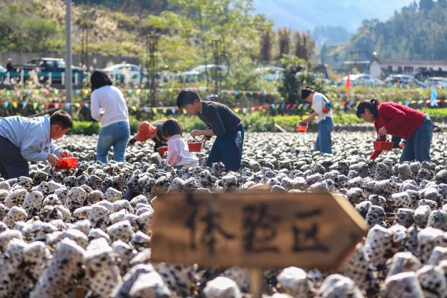 “采大不采小,眼快手快动作快,顺力拈下来就行!” 沙坡村村民任廷群一边熟练采摘黑木耳,一边分享着三年来的采收心得。随着裁判员一声令下,木耳采摘专业竞技组的选手们穿梭在整齐的菌棒间,巧手翻飞采摘饱满耳片,现场氛围紧张热烈。考虑到不同人群需求,活动专门设置业余竞采组和儿童体验区,来自安徽的游客刘清华主动加入,向村民请教技巧,“第一次体验采木耳,感受到了劳动的乐趣,非常开心。”