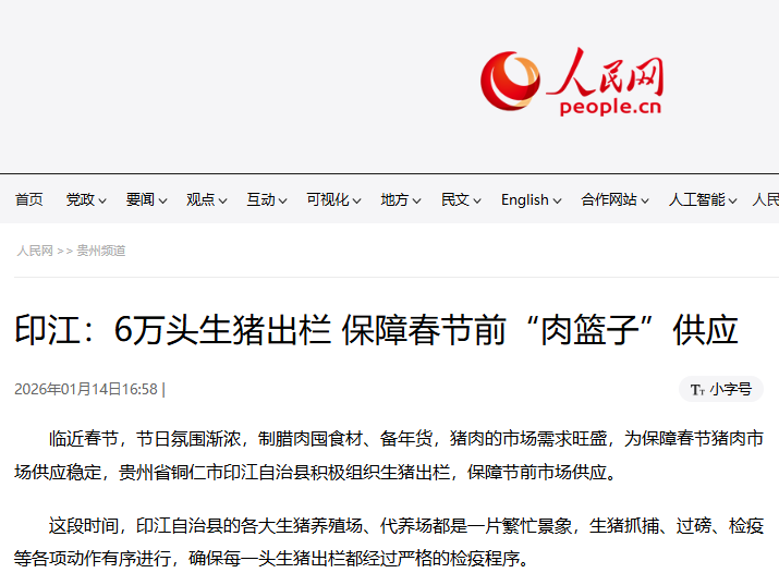 ▲1月14日,人民网报道贵州印江:6万头生猪出栏 保障春节前“肉篮子”供应