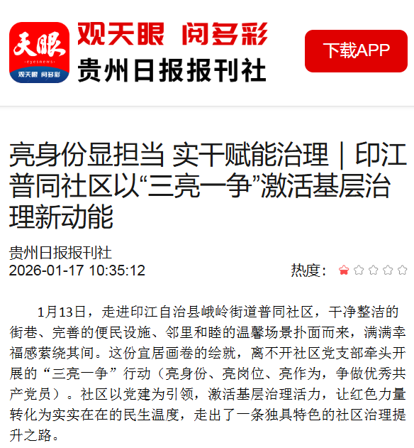 ▲1月17日,天眼新闻报道:亮身份显担当 实干赋能治理|印江普同社区以“三亮一争”激活基层治理新动能