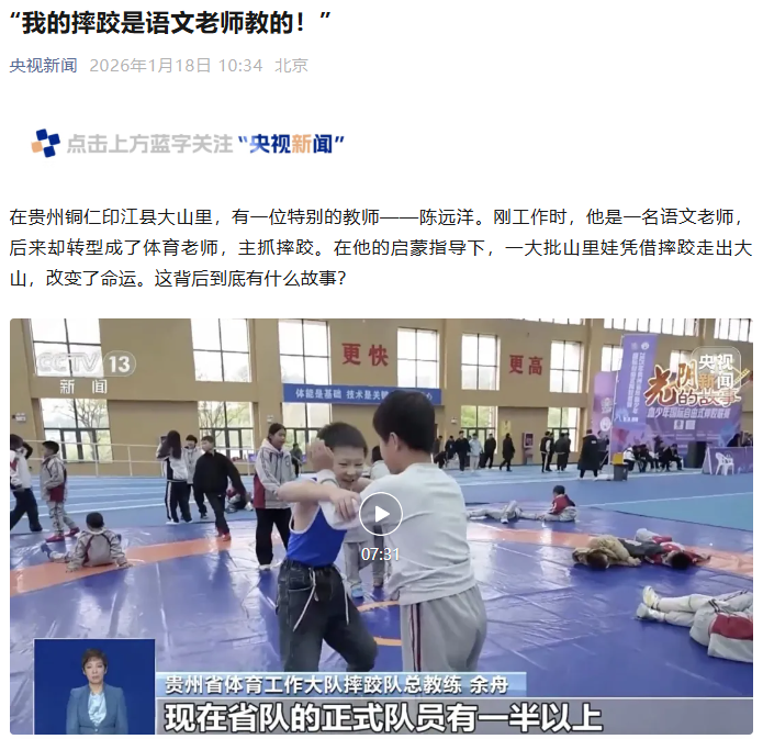 ▲1月18日,央视新闻报道贵州印江:“我的摔跤是语文老师教的”