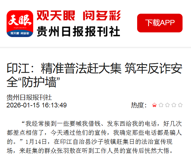 ▲1月15日,天眼新闻报道:印江:精准普法赶大集 筑牢反诈安全“防护墙”