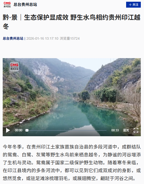 ▲1月16日,中央广播电视总台贵州总站贵州印江:黔·景|生态保护显成效 野生水鸟相约贵州印江越冬