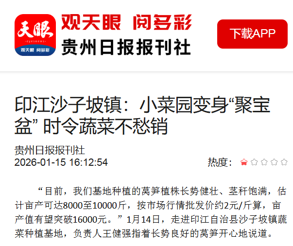 ▲1月15日,天眼新闻报道:印江沙子坡镇:小菜园变身“聚宝盆” 时令蔬菜不愁销