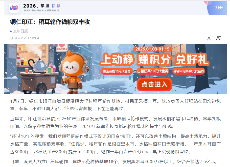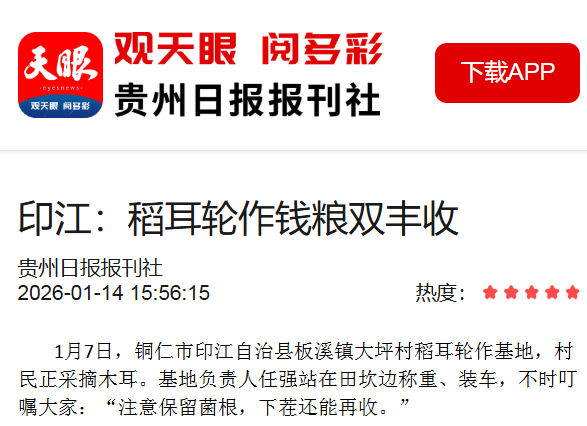 ▲1月13日,动静贵州报道:铜仁印江:稻耳轮作钱粮双丰收