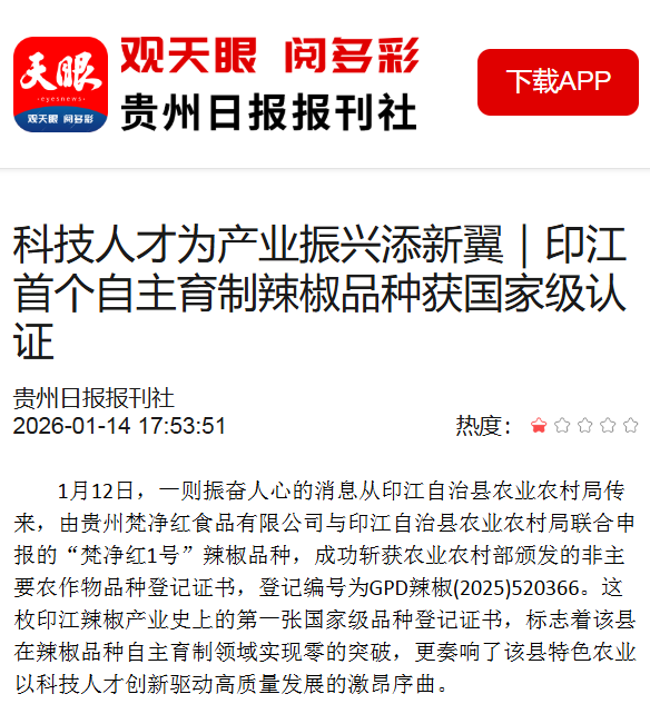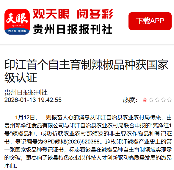 ▲1月14日,天眼新闻报道:科技人才为产业振兴添新翼|印江首个自主育制辣椒品种获国家级认证
