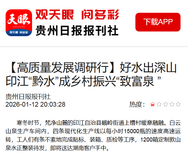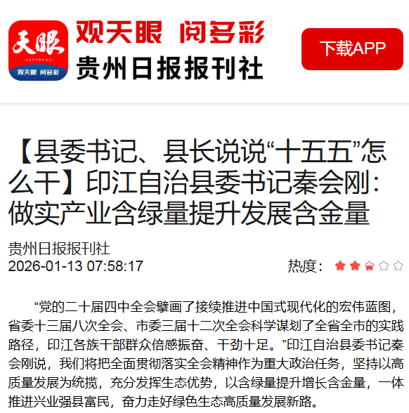 ▲1月13日,贵州日报报道印江:印江自治县委书记秦会刚:做实产业含绿量提升发展含金量、村戏引客促消费
