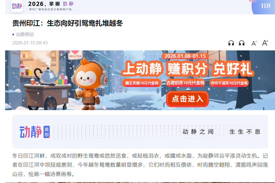 ▲1月17日,《铜仁新闻联播》报道 【走向生态文明新时代】印江生态持续向好 野生鸳鸯扎堆越冬