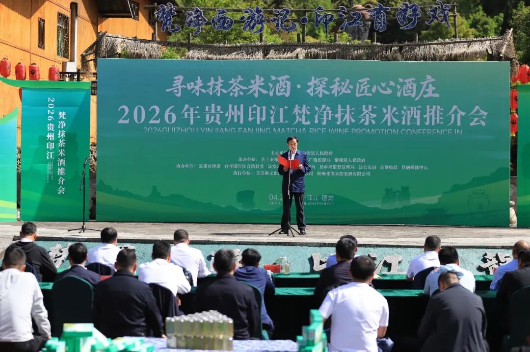4月25日,印江自治县2026年梵净抹茶米酒推介会在紫薇镇团龙村广场举行。市工信局副局长江旭出席并讲话,县委副书记、县长田杰致辞,贵州大学酿酒与食品工程学院院长黄永光作新品发布。县政协主席黄仕军,贵州印江经开区党工委副书记、管委会常务副主任田猛及相关县领导出席。副县长田姣主持。